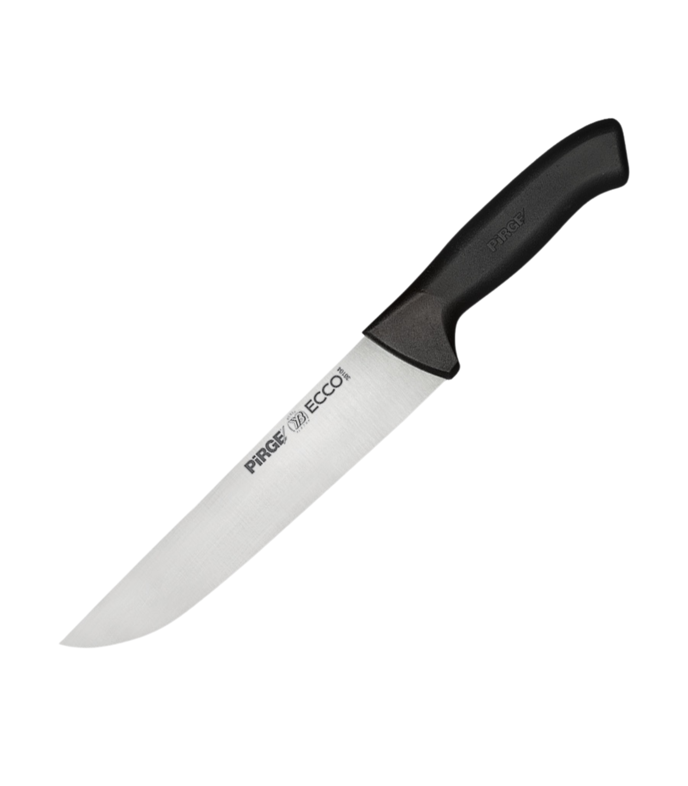 PIRGE Ecco butcher knife: equipped with a finely crafted 40 mm x 210 mm x 2.5 mm blade for professional use. The slim handle not only adds a touch of elegance, but also ensures a comfortable and secure grip during precision cuts. Expand your butchering experience with this razor-sharp, German-made knife and make it an essential tool for chefs and butchers alike. German precision, unsurpassed quality: these butcher knives made in Germany are characterised by steel quality, which complies with the DIN 1.4116 standard. They are ice-hardened to a rugged hardness rating of 55HRC and provide exceptional durability and a razor-sharp edge for precise cutting in professional kitchens. Comfortable handling with basic comfort handle: the knives have a basic comfort handle made of PPC (polypropylene copolymer), which ensures a comfortable and secure grip. This ergonomic design ensures that chefs can safely handle the knives for extended periods of time, enhancing their overall kitchen experience. ROUNDED BACK CORNERS AND LONG ERL: These knives are designed for safety and have rounded back corners, minimizing the risk of accidents during use. The long tang provides balance and allows controlled and precise cutting movements in professional culinary environments. Razor sharp cutting for precise cutting: the knives have a razor-sharp cutting edge and are therefore indispensable for precise cutting tasks in butchers and professional kitchens. From trimming to cutting, these knives ensure efficient and precise cuts and reflect the tip of German craftsmanship.