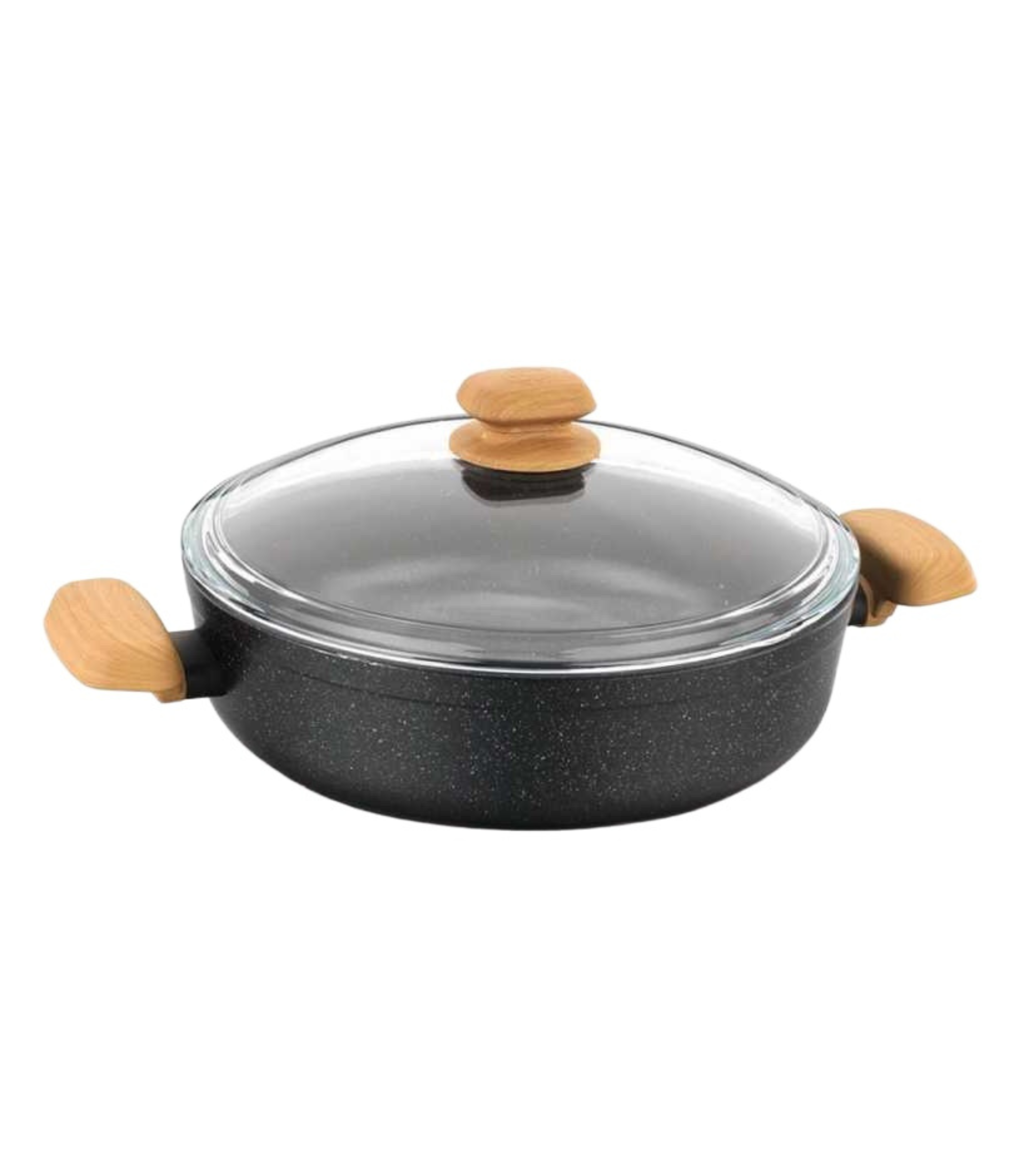 Montana, produced from recycled, completely natural material, with environmentally friendly technology, makes delicious meals using very little oil with its extra scratch-resistant volcanic-looking PTFE coating and high-temperature resistant silicone outer coating. The included glass lid allows you to keep an eye on your food while it cooks making sure your dish is perfect every time. The gorgeous black speckled appearance with faux wooden handles looks great in any kitchen. |